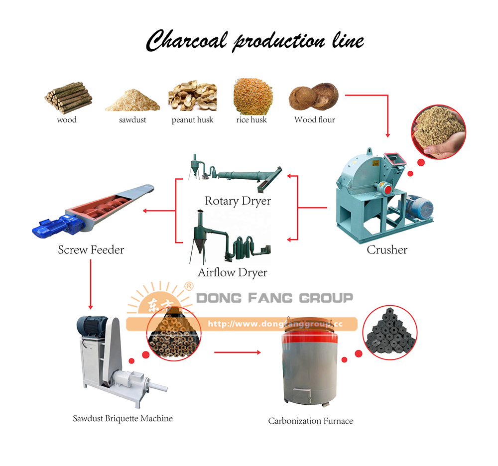 The raw material is less than 5 mm of wood chips, sawdust, rice husk, cashew nut shell, peanut shell, coconut shell,straw, cotton stems, bamboo, coffee shell, jute rods, etc.